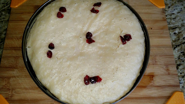 9. Take a round pan or cake pan or whatever you have (I used spice box which is used to keep multiple spices in small container in a single box, found in most indian kitchen) grease it with a few drops of coconut oil. At this point if you like nuts and raisins, you can sprinkle them,but I did not use it here, I used it on top at the end of last 5 min of cooking.Pour only 1/2 the pan.